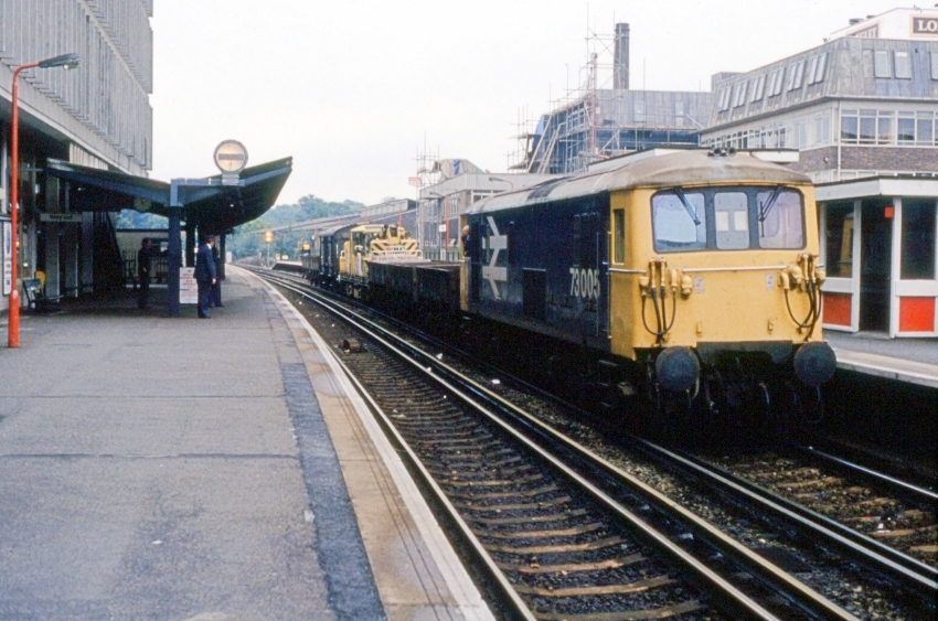 Electro-Diesel No. 73005 is seen on weekend engineering works alongside the "down" platform in this eastward view. Livery aside, it is a very 1960s scene. Evident on the left is the six-storey office block that became known as "Overline House", the ground floor of which is home to the booking hall. The "up" platform was equipped with the V-shaped canopy from the outset, whilst passengers on the "down" side made do with waiting shelters. The footbridge was behind the camera. © David Glasspool Collection