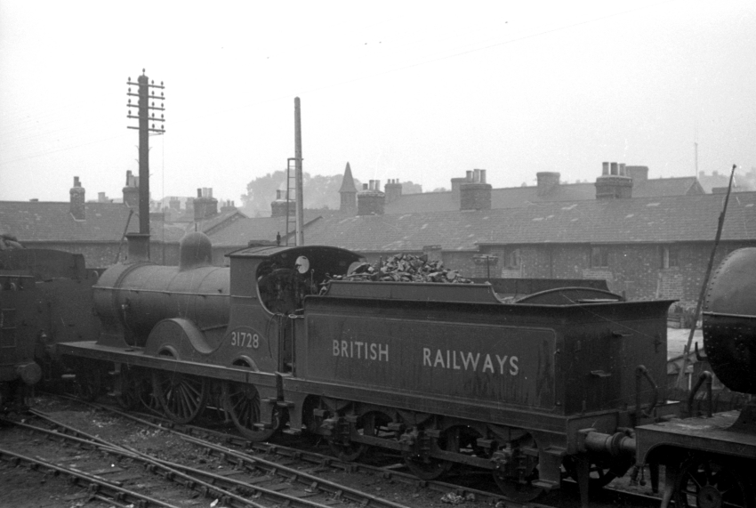 In October 1955, No. 31734 was withdrawn from Tonbridge (74D) (ref: RCTS’ The Railway Observer, November 1955). At the end of March of the following year, this engine was reported as being at Ashford shed sporting a smart external appearance in lined black livery, albeit out of use (ref: The Railway Magazine, May 1956). Rostered trips for the Tonbridge-allocated "D" Class had been an early train from Sevenoaks to Brighton; the non-stop run in each direction between Redhill and Brighton of a through Birkenhead service; assisting an 0-6-2 tank on the Lancing to Brighton evening workmen’s train; and, taking the 9:30 PM from Brighton to Tonbridge (ref: The Railway Magazine, November 1954).