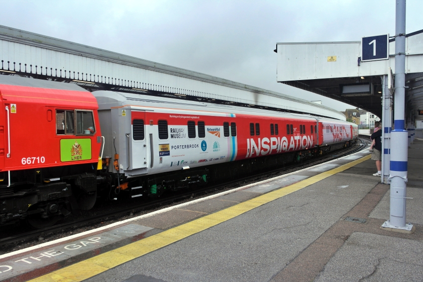 Former EPS generator car No. 96371 is seen at Margate as part of Network Rail’s "Inspiration" exhibition train, which was scheduled to tour the country for a year after launching at Paddington station on 26th June 2025. The train was at Margate on Sunday 20th and Monday 21st July, alongside platform 2, top-and-tailed by GBRf Class 66 Nos. 66719 and 66710. No. 96371 genuinely operates in the capacity of a generator vehicle on this train, as per its original proposed use on "Nightstar", by supplying electrical power to the other carriages. The vehicle is still owned by "Eastern Rail Services". © David Glasspool