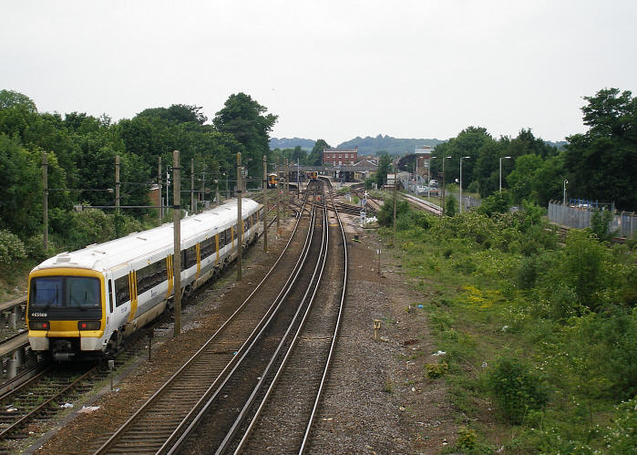 A westward view down the throat of the station shows Class 465 No. 465908 stabled in one of three electrified