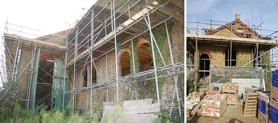 the wagon repair shop in the fork of the diverging Thanet and Dover routes, the building retains its wooden double doors. New timbers are evident