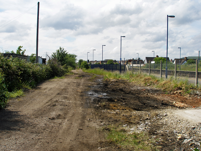 This is the former site of the ''up'' side goods yard, which remains undeveloped and instead serves as road access to the line. © David Glasspool