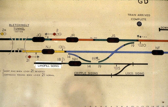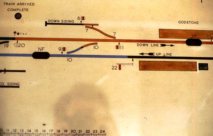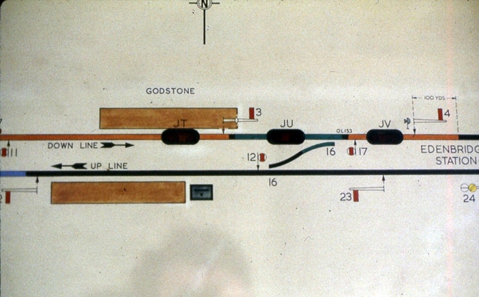 A close up of the signal box track diagram shows the eastern trailing crossover, and a series of semaphore and shunt signals. The boundary with Edenbridge can be seen encroaching to the right. © Peter Gibbons