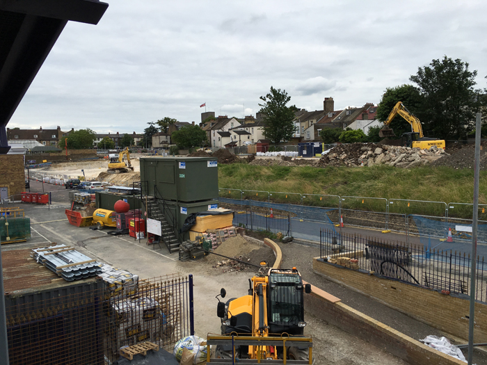 A view looking south from the footbridge shows that Rathmore Road remained open, but that the car park had been commandeered by JCBs and turned into a sea of soil and rubble. To the bottom right can be seen a new footpath leading to the site of the "cycle hub", which was under construction. © David Glasspool