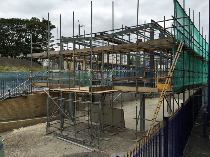 Turning to the right of the previous view, the steel structure of the "cycle hub" is in evidence. The footpath can be seen leading to the proposed ground floor entrance; an opening from the upper storey would also face onto Rathmore Road. © David Glasspool