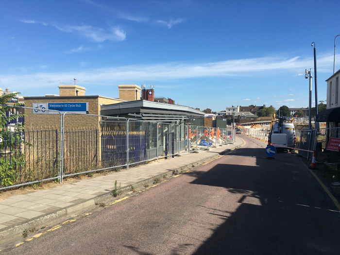 In conjunction with the road works, building also got underway on a "cycle hub" for railway commuters. This is a two-storey-high structure formed of a steel frame partially encased in light brickwork and mostly clad with glass, within which secure storage for 220 cycles is available. It is located behind the western end of platform 0, adjacent to the footbridge and along Rathmore Road, and funding for the scheme came jointly from the Department for Transport and Kent County Council, the pair providing £682,000 and £539,000 respectively. The facility was due to open during summer 2016, but works were still ongoing in late September. The larger road improvement scheme was not due for completion until January 2017.