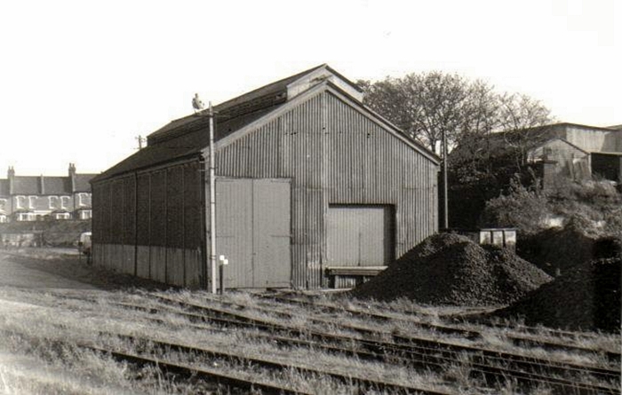 The goods shed was still very much intact when photographed by Tom Burnham in the early 1970s, the branch having been subject to complete closure in March 1968. The corrugated pitched-roof building retained its wooden double-doors and a rail connection. The track work was, too, virtually complete. © Tom Burnham