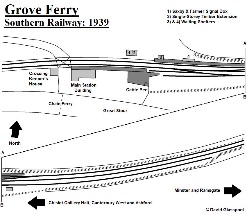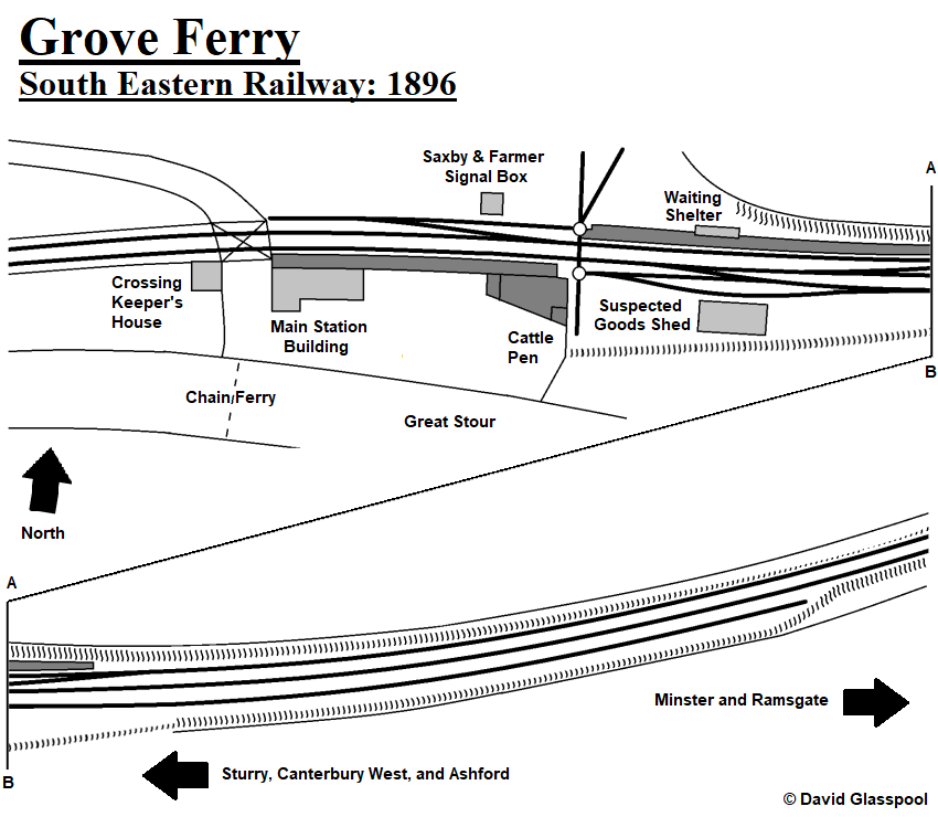 The Ramsgate extension, like that between Ashford and Canterbury, was also double-track. At Grove Ferry, two platforms were evident from the outset, built in the staggered arrangement which became somewhat of an SER tradition. A track foot crossing connected both platforms, and the former was also host to a track running perpendicular to the running lines, linking a pair of wagon turntables. The platforms were arranged in a fashion that ensured passengers using the track foot crossing walked behind a train stopped at the station.