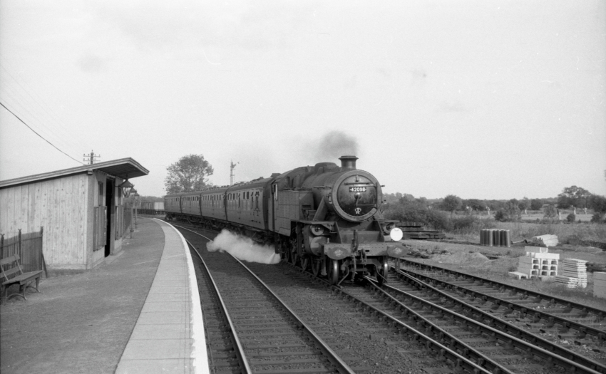 Fairburn 2-6-4 Tank No. 42098, showing a "74A" Ashford shed plate, is seen in this eastward view, approaching with a service from Margate to Ashford, formed of Bulleid carriage stock. By this time, Ashford had ceased to be an "A" shed and was coded "73F". Behind the train, in the distance, can be seen wagons parked in the "up" siding, its connection with the running line of which the locomotive was about to pass over. The trailing crossover between the running lines can just been seen beneath the second carriage. The "down" side timber waiting shelter, seen on the left, was of generous proportions, and was by this time complemented by a second shelter behind the cameraman. The Victorian lamp standards were a feature until the end. Electrification materials are in evidence to the right of the tracks. © David Glasspool Collection