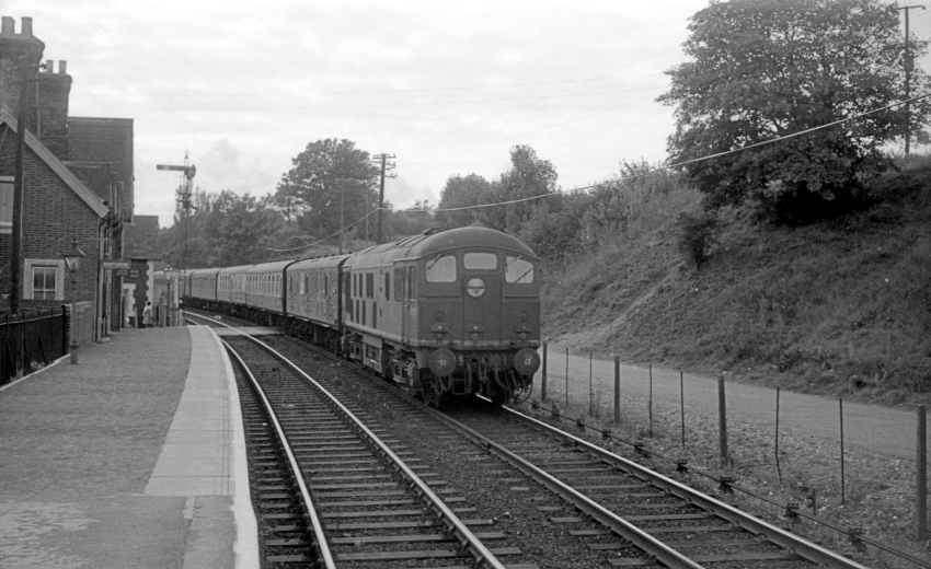A fleet of sixteen "Sulzer" Type 2 diesels were loaned from the London Midland Region to the Southern between 1959 and 1962, being allocated to Hither Green. Fitted with boilers, the type could be used to heat steam-hauled carriage stock. On a Saturday, No. D5007 is seen in this westward view heading in the "down" direction with what your author surmises is a weekend special to Margate, possibly an inter-regional working via Kensington Olympia. Behind the locomotive is a BR Mk 1 General Utility Van (GUV), followed by BR Mk 1 passenger stock and, furthest from the camera, what appears to be a Maunsell vehicle. On the left is the attractive main station building, situated behind the "up" platform, demonstrating its prominent gables. Sadly now long-gone, a variation of this architecture still survives today at Wye. Beyond the end of the platform can be seen the edge of the crossing keeper's house; the same design also came into use at Chilham Mill Crossing, about 220 yards south of Chilham station, but sadly both examples were destroyed. The open space beyond the fence on the right was once host to the "down" siding, and the signal box is just out of view to the right. © David Glasspool Collection