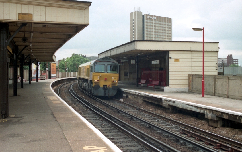 "Amey Roadstone Corporation" (ARC) Class 59 No. 59102 rounds the curve beside platform 1, hauling empty aggregate hoppers from Allington Siding, near Maidstone, to Acton Yard, West London. The sides of the huge waiting shelter on platform 1 are of tongue-and-groove timber construction, but its canopy valance is fabricated from riveted metal. © David Glasspool Collection