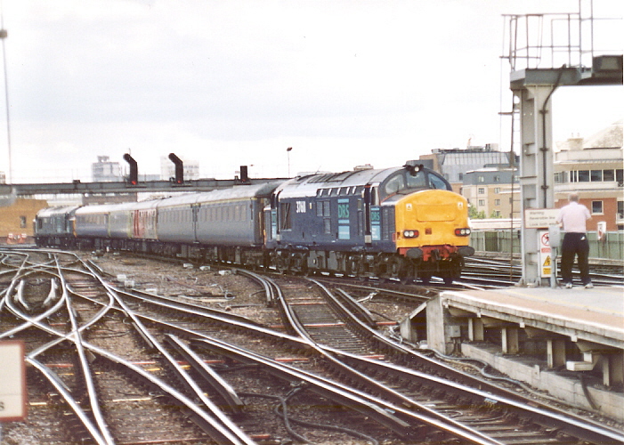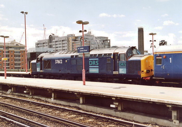 No. 37612 was joined by classmate No. 37611, the pair top-and-tailing four air-conditioned BR Mk 2 carriages and one heavily modified BR Mk 1 vehicle. All platforms at Cannon Street have been capable of handling twelve vehicle formations since surface extensions were completed in 1991. © David Glasspool