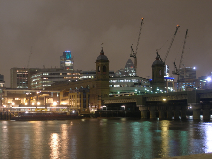 A night view across the Thames from the South Bank shows that only the two towers and truncated sections of the side walls still exist as remnants of the original SER station of 1866. Since the dismantling of the graceful trainshed roof in 1958, the station's concourse and surroundings have become host to towering office blocks. Complete modernisation was completed with the building of yet another office block during 1988/1989, which bridged the gap in-between the SER yellow brick walls. Even the railway bridge is a modern affair, being the result of a three year reconstruction which commenced in 1979. The office block of 1965 can be seen in the background, on the far left, and this marks the position of the former City Terminus Hotel. © David Glasspool