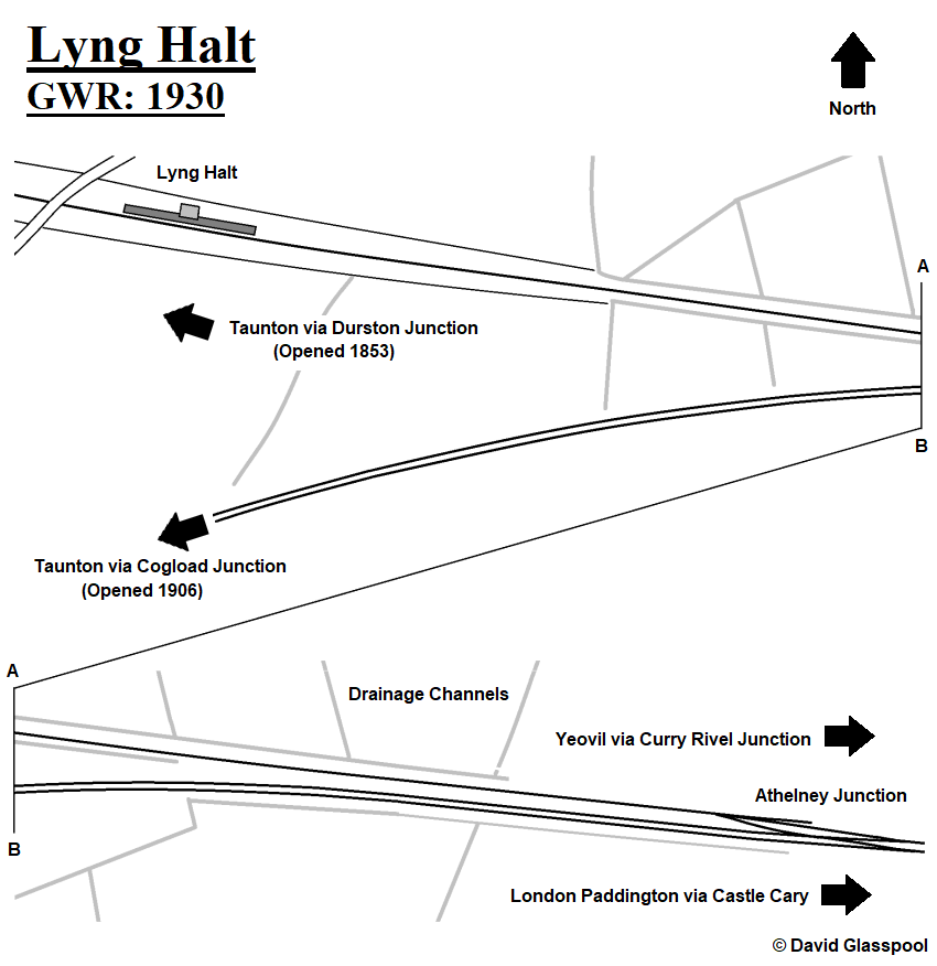 The nineteen-mile single-track Broad Gauge line between Durston Junction (5¾-miles east of Taunton) and Hendford (Yeovil) was opened in 1853 by the Bristol & Exeter Railway and converted to standard gauge in 1874. However, the diminutive halt at Lyng, in rural Somerset, was a much later affair, being brought into public use on Monday, 24th September 1928. The station was located 1½-route miles from Durston Junction, the latter being where the branch to Yeovil diverged from the Great Western Railway’s main line to the south west.