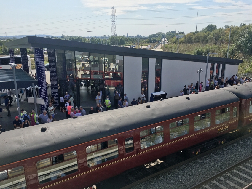 By February 2015, the main station building at Oxford Parkway was largely complete and concrete-sleeper double-track laid, albeit the latter was not yet fully ballasted — the platforms and footbridge had also not been started. The main building was positioned on the eastern side of the rails and comprised a sloping distorted roof of about 26-metres by 20-metres dimensions. A light and airy glazed ticket hall was provided, adjacent to which was an area destined to become a coffee shop. Construction was swift, for the station formally opened on Sunday, 25th October 2015, the first arrival being the 07:25 departure from Marylebone (ref: Branch Line News No. 1245, Branch Line Society, 4th November 2015). At this time, the section from Oxford Parkway to Oxford North Junction had not opened to passenger traffic. From the outset, trains typically arrived and departed from the new station’s platform 2; a trailing crossover east of the station facilitated a change between tracks (ref: Branch Line News No. 1245, Branch Line Society, 4th November 2015). At the time of Oxford Parkway’s opening, finishing touches were still being put on station. Regular passenger services were extended from Oxford to Oxford Parkway on 11th December 2016; a formal opening of this section of the route was conducted by the Transport Secretary the following day (ref: The Railway Magazine, January 2017).