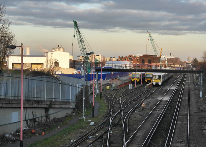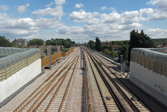Plumstead station is behind the camera in this eastward view, which shows three electrified sidings and the Southern Railway-built substation. The white gantry crane in the background, behind the substation, marks the site where the tunnel portal has been constructed. The metal-clad building on the left, reflecting the sunlight, is the slurry treatment plant. © David Glasspool