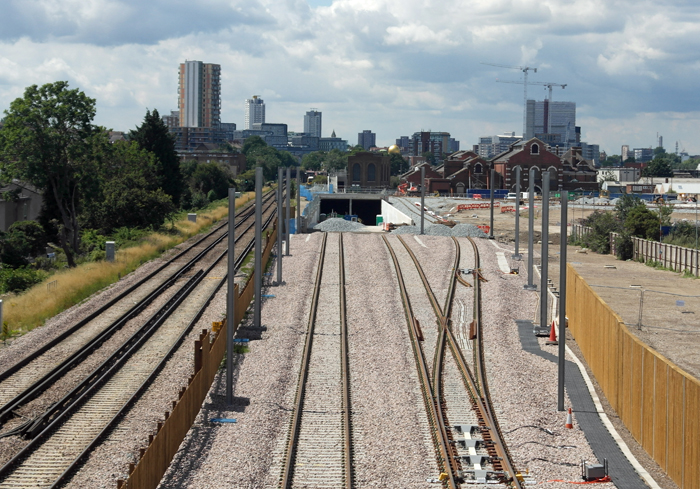 Abbey Wood station is 2⁄3-mile behind the cameraman in this westward view, which shows much progress having been made on the Plumstead railway lands. The double-track of the North Kent Line is on the left-hand side, continuing onto Plumstead and Woolwich Arsenal stations. The freshly-ballasted double-track of the Crossrail branch can be seen stopping short of the tunnel portal, for which the lines have been widened on the approaches. © David Glasspool
