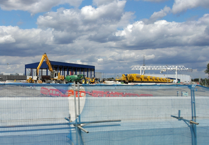The concrete partition in the foreground is that of the tunnel portal approaches. Behind, we see a series of recently-laid sidings which sit at about 45-degrees to the running lines. Some of the yellow wagons of the concrete train © David Glasspool