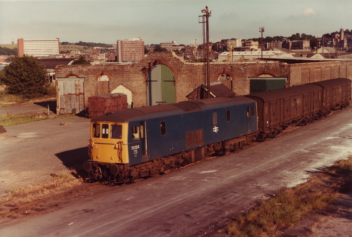 This bygone southward view from the lattice footbridge during 1984 reveals Electro-Diesel No. 73124 posing in front of the goods shed with a pair of SR Parcel Vans. No. 73124 remains in existence, but since 1984 has carried the revised number 73205. This number was applied when the locomotive became dedicated to the InterCity Business Sector's ''Gatwick Express'' fleet. No. 73205 is now under the ownership of GB Railfreight. © Chris