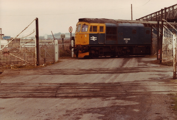 This is Blue Boar Lane Level Crossing, which cut through the middle of the sidings, requiring a multitude of crossing gates, some of which are seen here in this view from 1984. The majority of these gates did not meet in the middle, thus it was still possible to walk around them when they were closed. The level crossing was the rough boundary between what was considered ''Rochester Freight Depot'' and ''Chatham Sidings''. Class 33 No. 33049 is in view: the locomotive was fronting a pair of ''Railfreight'' branded vans. © Chris
