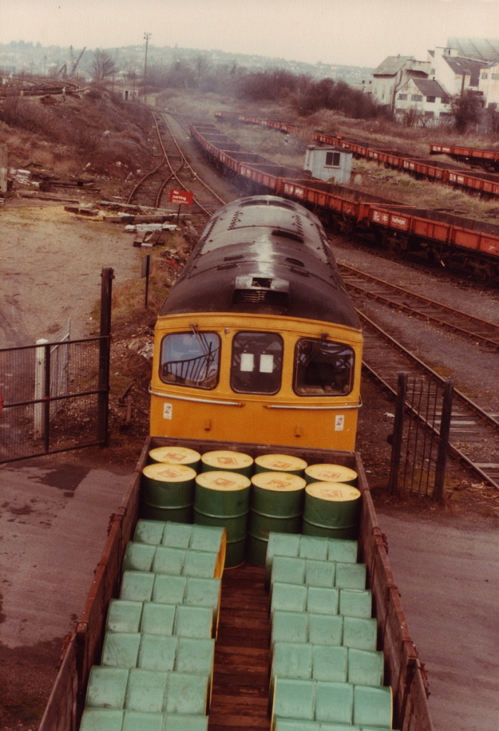 A northward view from 1984 shows what is thought to be No. 33049 fronting a wagon containing drums of lubricating oil. In the background can be seen rows of SPA 31.5 tonne steel plate wagons, which were two-axle air-braked vehicles. These SPA wagons had been stored in the yard for some time. © Chris