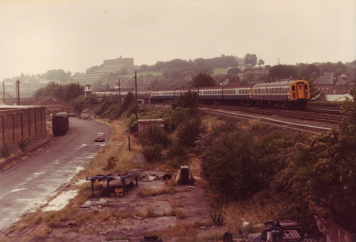 A southward view towards the station during 1984 shows a motley collection of EMUs making their way to Ramsgate. On the rear is a 4 VEP driving trailer, next is a 4-CAP unit, beyond that a 2 EPB, and finally the remaining three vehicles of the 4 Vep unit. On the left is the side wall of the goods shed. © Chris