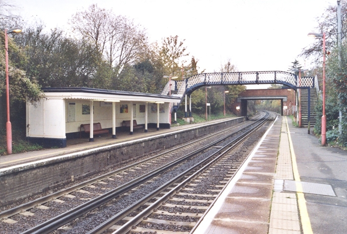 An eastward view reveals the original waiting shelter and the 1937 lattice footbridge. The shelter here is unusually lengthy and its side walls formerly extended around to the front, each end at least reaching the first canopy strut. The brick foundations are prominent in blue, although several paint applications over the years gives them a concrete appearance. © David Glasspool