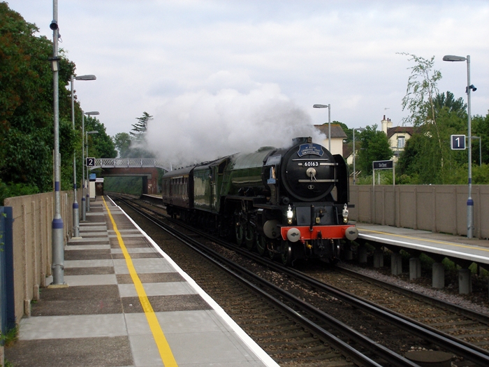 A special guest: Peppercorn "A1" Pacific No. 60163 "Tornado" passes through Sole Street, hauling just a single BR Mk 1 support coach. The locomotive was heading to Hither Green Depot, via St Mary Cray and Chislehurst Junctions. The engine had been declared a "failure" at Canterbury West, before hauling a return leg of a rail tour. The latter had emanated from Newport, South Wales, and been diesel hauled to Willesden Junction, No. 60163 taking over there. During a layover at Canterbury, concerns about a boiler stay were brought to the fore, and it was decided the best course of action would be to remove the locomotive from service. ©