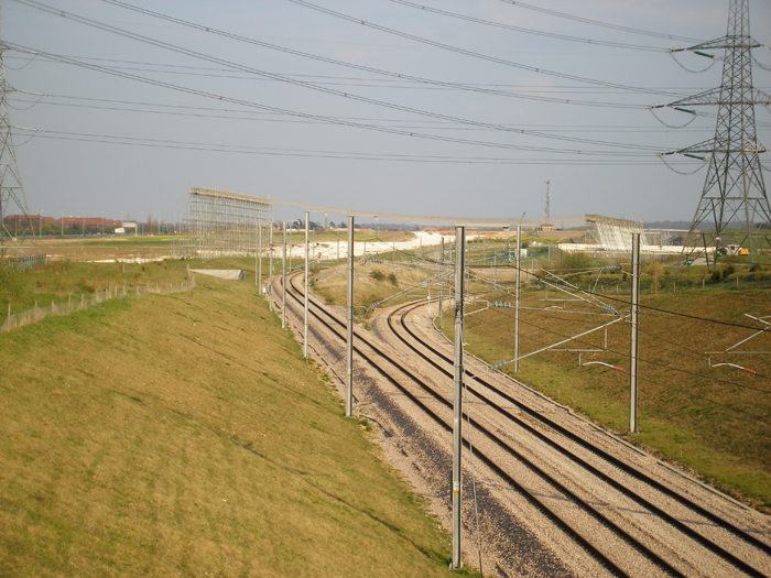 This eastward view, beyond the curve seen in the previous photograph, shows the double-track of the Waterloo Connection diverging to form the "flying junction" link with the CTRL. A netting, supported on either side by scaffolding, had also appeared over the lines, which was to allow the renewal of the above National Grid power cables. © David Glasspool