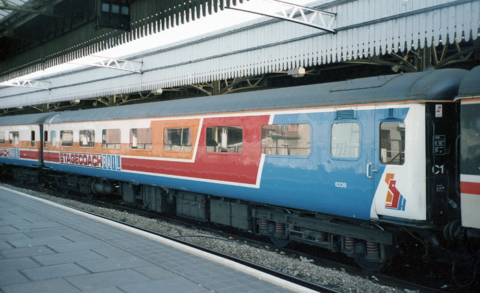The carriages selected by Stagecoach were BR Mk 2D vehicles from the pool of the InterCity business sector: Nos. 6201, 6202, 6210, 6224, 6228, and 6232. These were repainted into Stagecoach’s colours - a white background with large orange, red, and blue stripes - emblazoned with “Stagecoach Rail” in capital letters across their sides. The work was undertaken at Derby by BREL Ltd, which included laying new flooring and abolishing a W/C in each carriage. The new vehicles were officially launched at Derby on 7th May 1992.