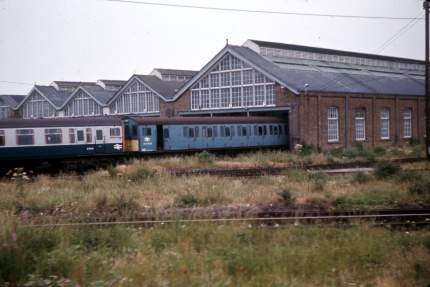 Another view, a little right of the previous photograph, better shows the extension of 1908, which is taller than the original building. In view is driving trailer S76331 of 4-TC unit No. 401, in the company of Class 501 driving vehicle No. DB975029. The latter was once part of a test unit that was based at Strawberry Hill. © David Glasspool Collection
