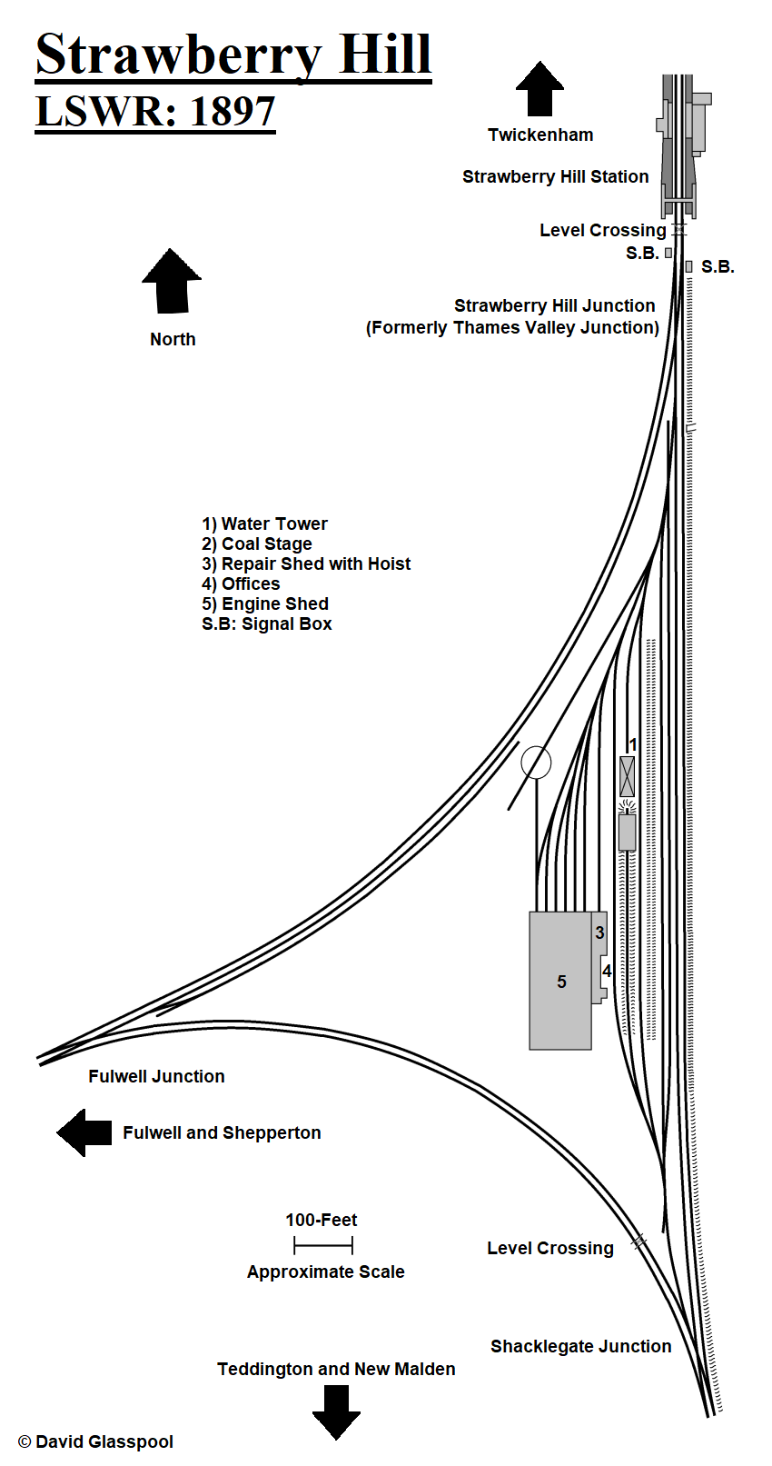 The London & South Western Railway’s (LSWR) original engine shed at Strawberry Hill was built to the design of Mr. E. Andrews, the company’s Chief Engineer, under the superintendence of the District Engineer, Mr. A. W. Szlumper. The contract for erecting the motive power depot was carried out by Messrs. Perry & Company, Bow, East London. A six-road dead-end shed was in evidence, the building measuring 210-feet in length by 100-feet in width (64-metres by 30.5-metres), which was able to accommodate eighteen tender locomotives or thirty tank engines. Each shed road was equipped with an inspection pit for its entire length, and one of these was fitted with six hydrants specifically for washing out engines. One side of the building was fabricated from a basic combination of timber framing and corrugated iron that was easily removable, to facilitate a straightforward extension of the engine shed if required in the future (ref: The Railway Engineer, July 1897. This source refers to the depot as both a "running shed at Fulwell" and "Strawberry Hill"). A 50-foot turntable was provided at the northern end of the triangular site, capable of handling the LSWR’s largest engines.