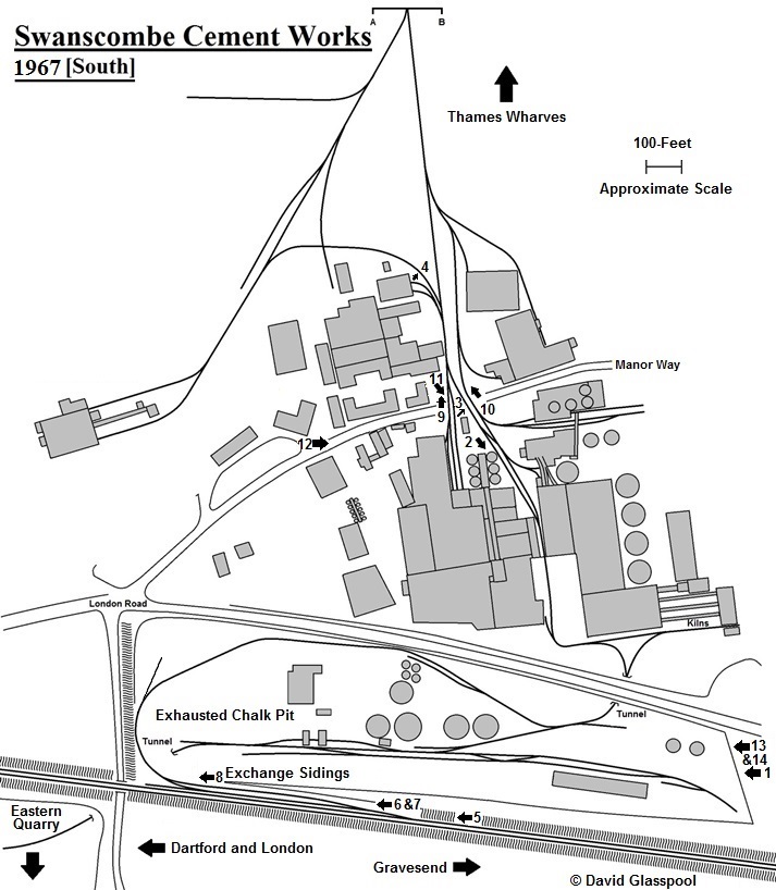 Maps from the 1860s show the Swanscombe works to be feeding off a single chalk pit located on the southern side of London Road, just above the 1849-opened North Kent Line. A thoroughfare between the main works and pit was afforded by boring a tunnel through the chalk ridge under the road. By this time, the internal railway network was already extensive, the aforementioned chalk pit accommodating twenty-one sidings, these of which fanned out from a single track laid through the tunnel. Within the main works complex, north of London Road, a series of sharp railway curves linked the various buildings on the site, and extending northwards for ½-mile was a single-track line across the marshes which terminated at a wharf on the Thames.