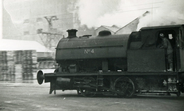 Photograph 3: Saddle Tank No. 4 is seen heading northwards at Manor Road level crossing. In the background can be seen one of the pylons which carried an aerial cableway, this running from the Thames Wharves to the main cement works' buildings north of London Road. © Roger Goodrum
