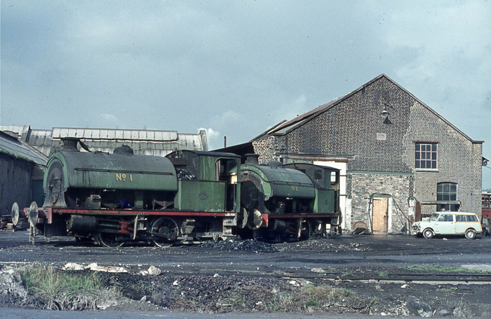 In the company of a "Mini Traveller", Hawthorn Leslie saddle tank Nos. 1 and 2 are seen parked in front of the works' engine shed, the latter of which appears to have received extensive wall repairs. No. 1 can now be found on the Colne Valley Railway in Essex, but No. 2 was not so lucky. © David Glasspool Collection