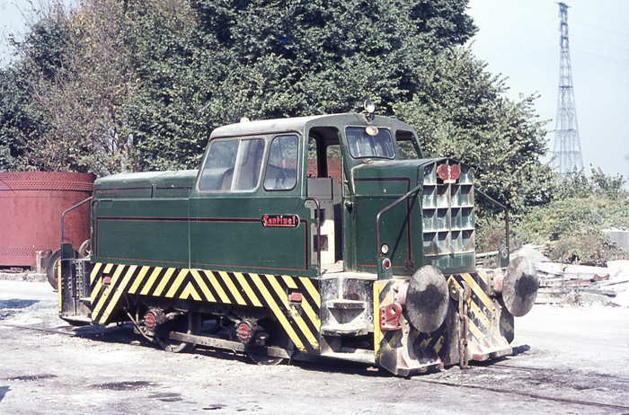 Photograph 4: Diesel dawn. To replace the 0-4-0 saddle tanks, a fleet of Rolls Royce-built Sentinel diesels arrived at the works in 1971. In the background is one of two 623-feet-high pylons, completed in 1965, which carries electric cables across the Thames. © David Glasspool Collection