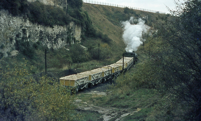 This is one photograph in this section which is not numbered, because it is out of the scope of either track plan by some margin. This is a north easterly view along that part of line which linked the exhausted chalk pit seen in the "South" track plan with Eastern Quarry. One of the 0-4-0 Hawthorn Leslie saddle tanks is seen hauling eight 4-wheel wagons, half loaded with chalk, towards the exhausted pit and, ultimately, the main works north of London Road. The kink in the wagon formation is a result of the train exiting a passing loop on this section of track. © David Glasspool Collection