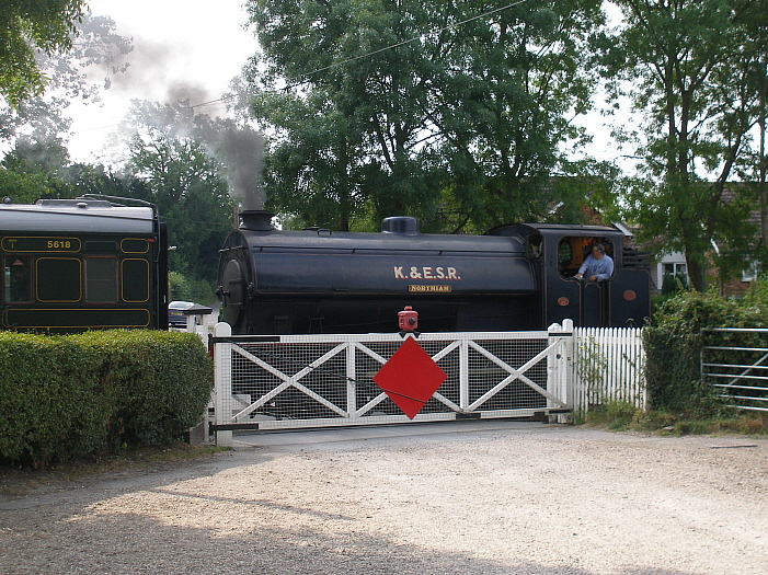 ''Northiam'' is seen departing with the aforementioned service, over the level crossing. Of note is the diamond