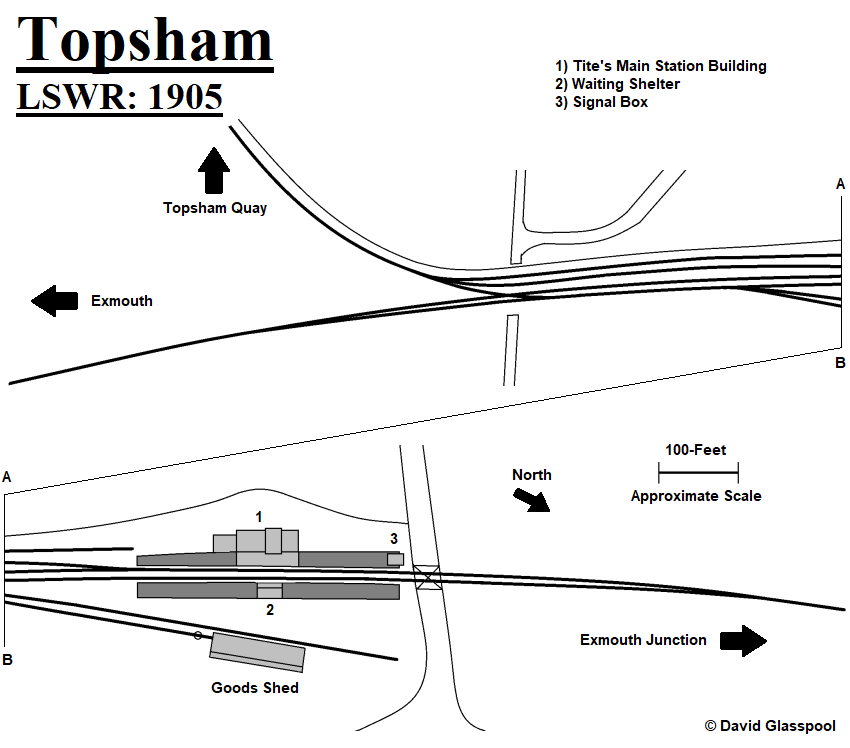 The goods yard existed on the "down" side of the line, behind the platform, and comprised two sidings. Of the latter, one terminated within a brick-built goods shed; although of red brick construction, this was to the same basic design as that which is still in evidence at Crewkerne. The ⅓-mile-long Quay branch made a series of connections with the running lines at the Exmouth end of the station, these of which can be seen in the diagram. Based on an article in the local press at the time, the quay branch, which descended at a gradient of 1 in 52, came into use slightly later than the rest of the station: