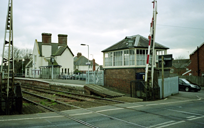 The signal box, built to an in-house LSWR design, was last used in January 1988, at which time control of the level crossing here was transferred to Exmouth Junction. Evident is the varying height of the Exeter-bound platform between the former station building and signal box. © David Glasspool