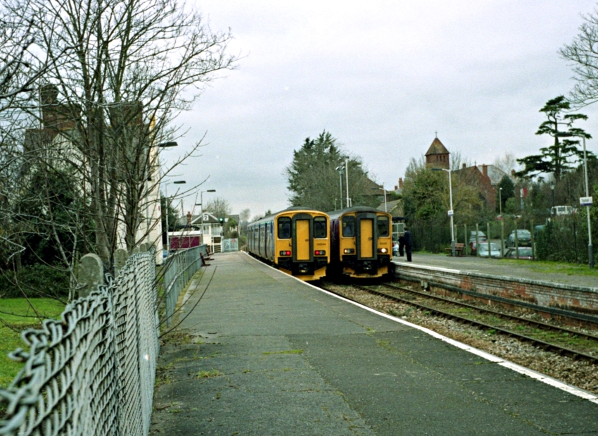 Topsham offers the only passing place on the branch line for trains. Here, Class 150 units are seen passing in the platforms, that on the left bound for Paignton via Exeter, the other for Exmouth. The car park on the right, behind the platform, is upon the former goods yard site. © David Glasspool