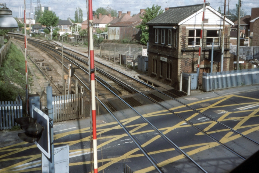 By 1978, the "down" side canopy had gone and been replaced by a rectangular glazed shelter. Next, as part of a resignalling of the Southampton area, signal boxes at Redbridge and Totton were abolished on Sunday, 28th February 1982, and Track Circuit Block working and colour lights introduced, controlled from Eastleigh (ref: British Rail, Southern, South Western Division, Signal Instruction 66 SWD). The level crossing at Totton was supervised thereafter from Eastleigh signal box by closed circuit television. Totton signal box had been completely demolished by 20th March 1982 and the crossings at Jacob's Gutter Lane (on the Fawley branch) and Ashurst that were formerly supervised from there were controlled from Marchwood and Eastleigh respectively. On Sunday, 7th March 1982, the junction with the Fawley branch was moved slightly further west; a new goods loop was also created by extending the headshunt of the existing "down" sidings' headshunt (ref: Branch Line News, Branch Line Society, 1st April 1982). In 1987, a restoration of the main station building was completed, which included spruced up red brickwork and stone edging, a repainted platform canopy, and renewed slate roofing. At this time, the timber structures that were on the western side of the main building were flattened, and new metal platform fencing upon concrete posts was installed.