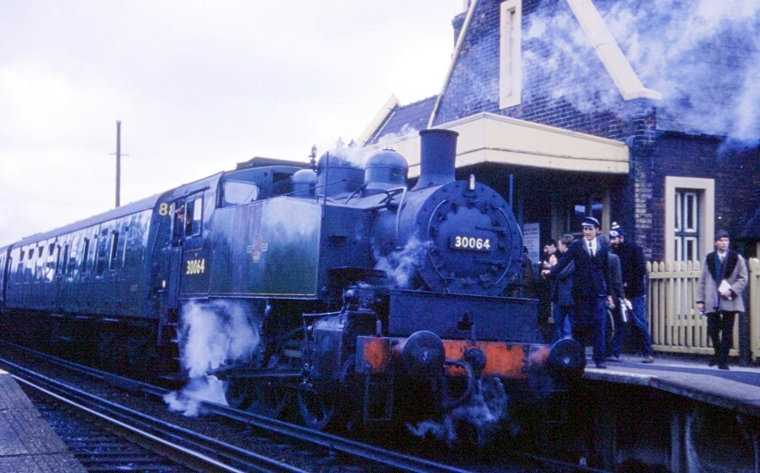 USA Tank No. 30064 is seen at Totton after arrival from the Fawley branch with the Manchester Rail Travel Society’s "Hants and Dorset Branch Flyer". The train had originated from Southampton Central, and No. 80151 would take the carriages back in the western direction to Brockenhurst. The main building here has shades of the larger LSWR station structures erected between Yeovil and Exeter during the same period; it must surely be the work of architect William Tite. The third rail is in place; steam had little over three months left in service between Waterloo and Weymouth. © David Glasspool Collection