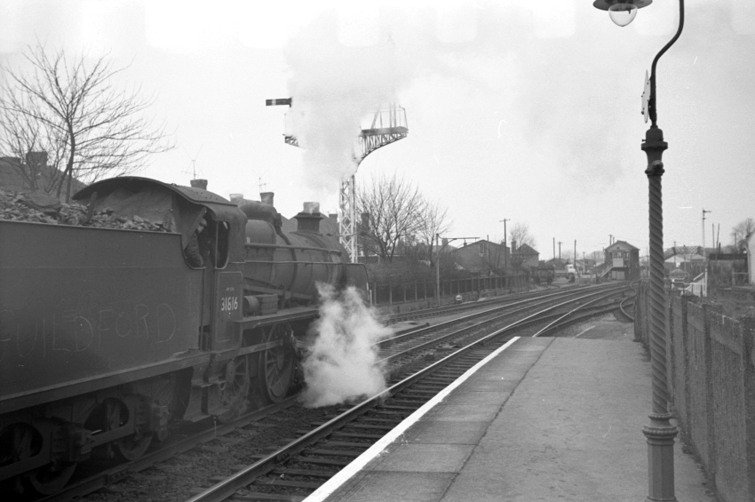 The signal box and footbridge over the running lines adjacent to the level crossing at Junction Road can be seen in the distance of this westward view from the "up" platform, depicting "N" Class No. 31816 with "Guildford" scrawled on the tender. The siding seen diverging to the right and disappearing behind the "up" platform terminated about 50-feet from the main building. SR concrete fencing and a barley-twist lamppost with "Target" name sign are in evidence on the platform. © David Glasspool Collection