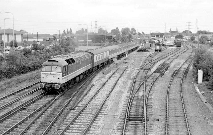 The former goods yard site west of the station, on the "down" side of the line, remained in use as sidings after closure in 1967, and this is still the case today. The set of points in the foreground provided access to a goods loop, created in 1982, which in turn led to the Fawley branch. In this eastward view, Class 47 No. 47818 is seen passing with an InterCity CrossCountry service, possibly from Manchester Piccadilly to Poole. © David Glasspool Collection