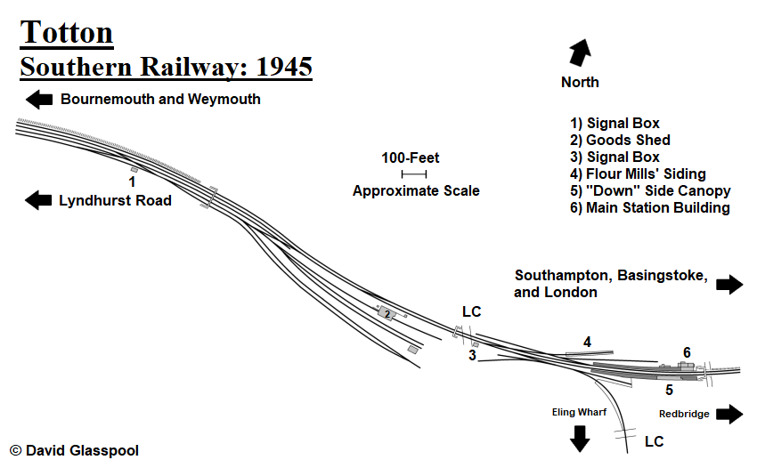 The level crossing which remained at Junction Road, west of the station, continued to be a point of contention between the SR and locals. The complaint of residents was that the crossing gates stayed closed against the road for too long. A bridge could not be built over the tracks at this point, but the question was raised if one could be constructed elsewhere. The Totton Ratepayers Association suggested that a bridge would be too costly and that the best course of action would be to approach the Southern Railway to ask for the duration of the gates being closed to be reduced (ref: The Hampshire Advertiser & Southampton Times, 9th July 1938).
